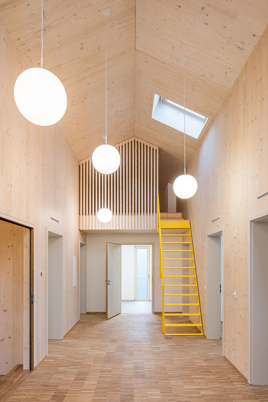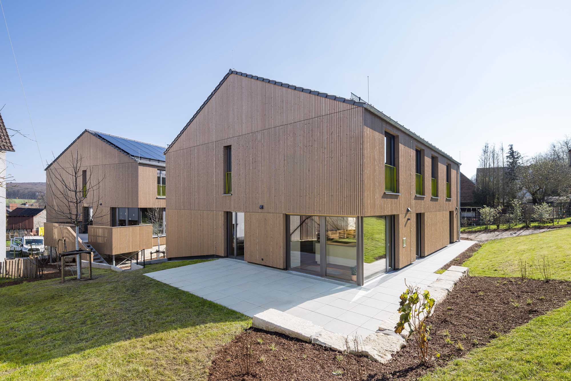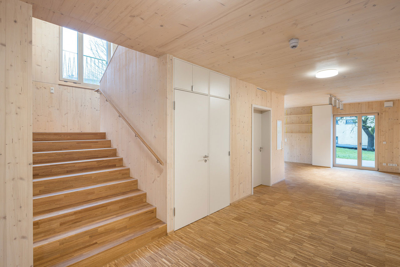 Das Raumprogramm wurde auf zwei Gebäude aufgeteilt um die dörfliche Struktur der Umgebung aufzunehmen und die beiden Wohngruppen abzubilden. Die zwei Baukörper mit Satteldach fügen sich wie selbstverständlich ein, ein gemeinsamer Hof dient als Erschliessungsbereich mit hoher Aufenthaltsqualität.