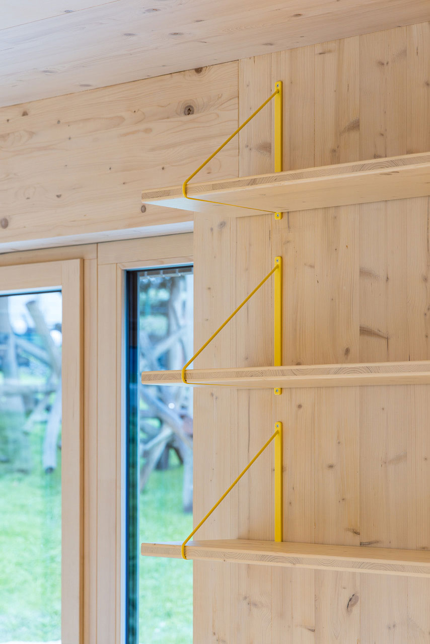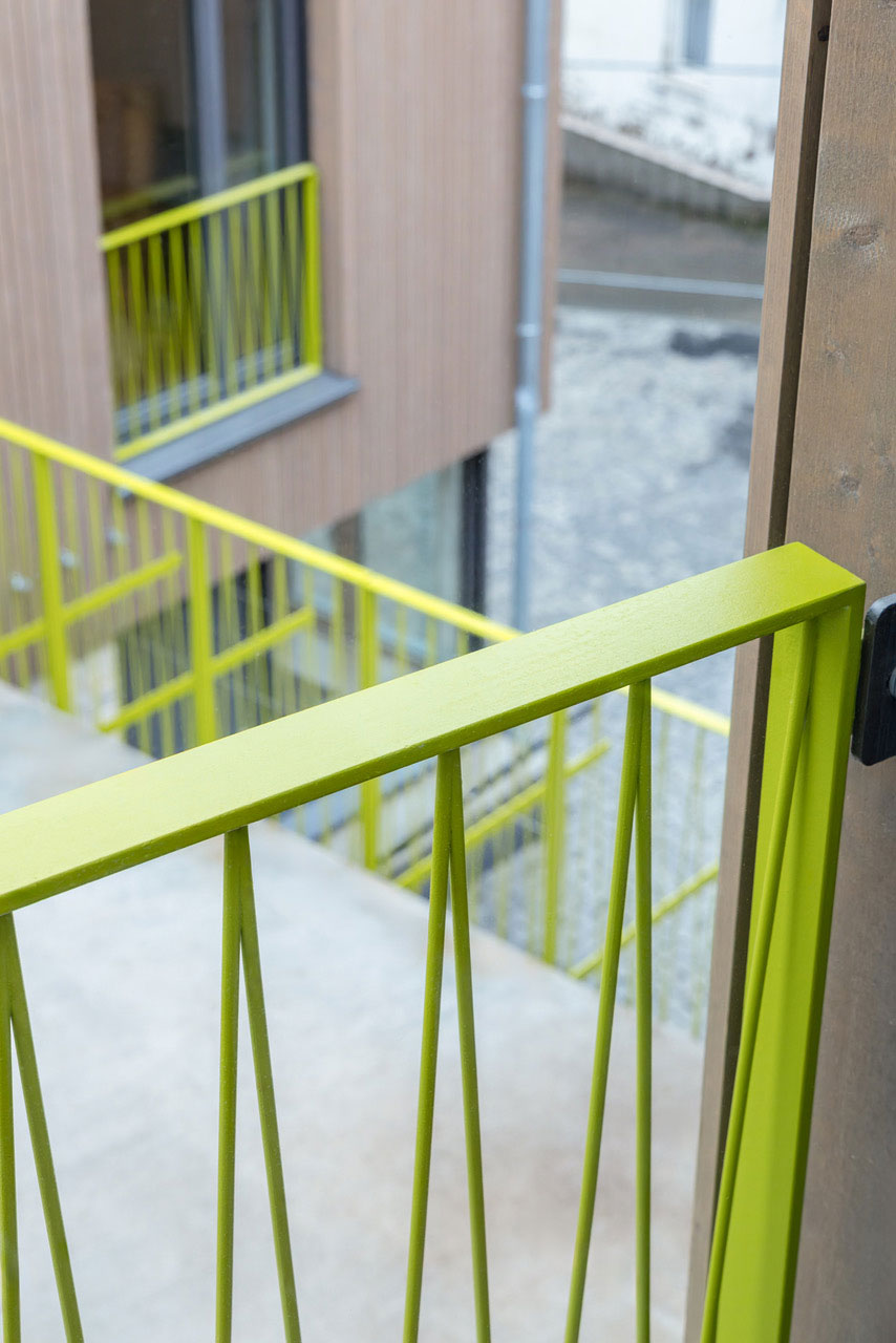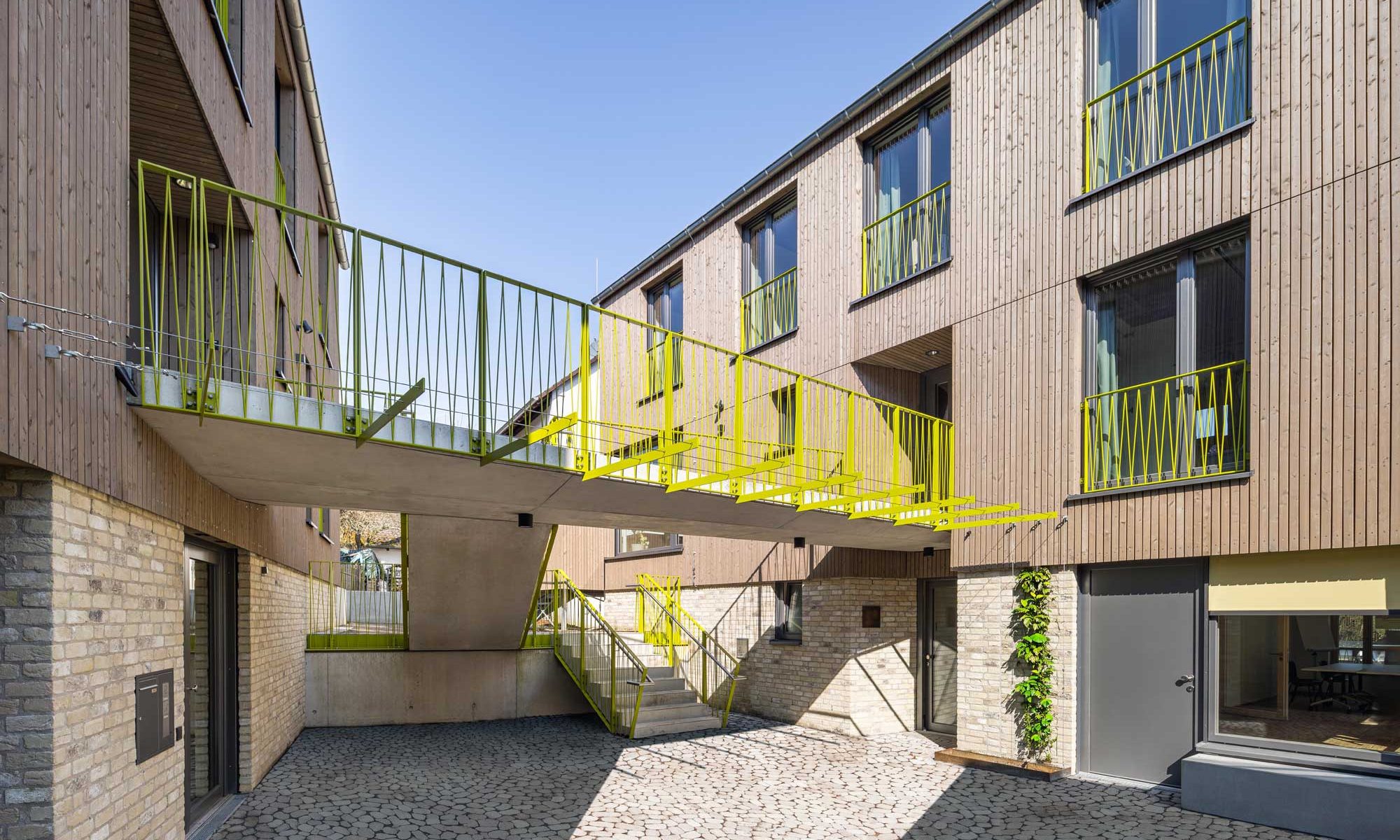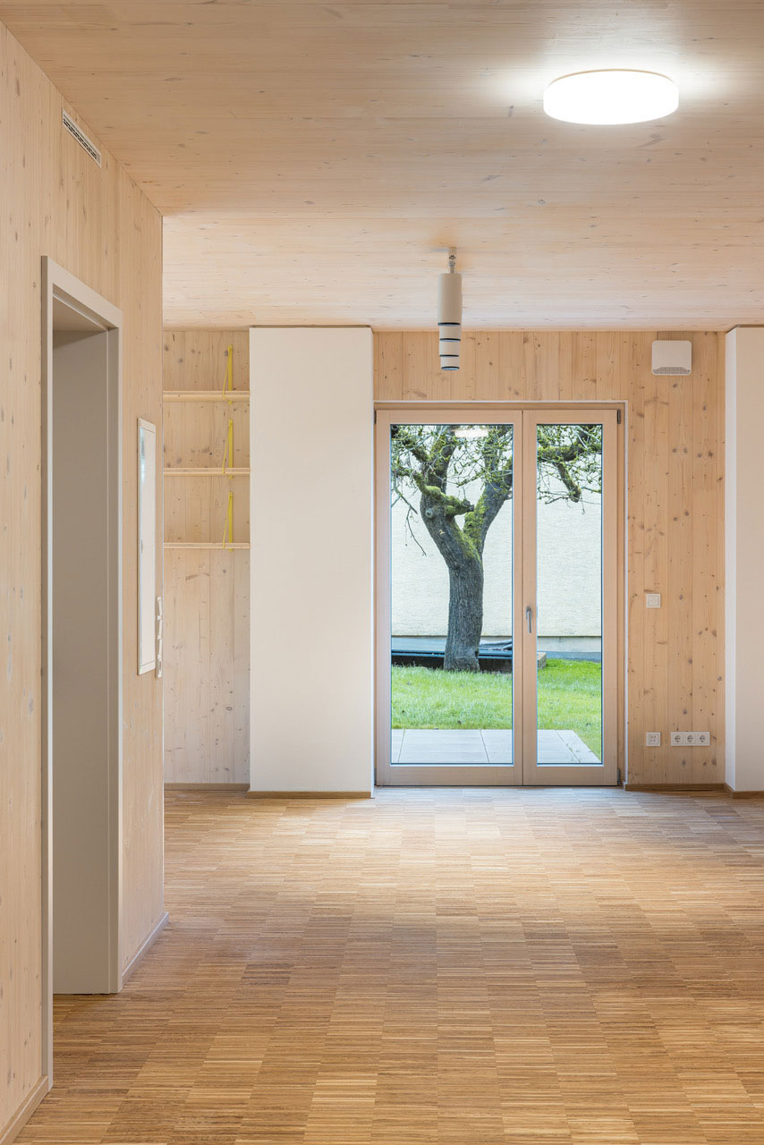 Das Raumprogramm wurde auf zwei Gebäude aufgeteilt um die dörfliche Struktur der Umgebung aufzunehmen und die beiden Wohngruppen abzubilden. Die zwei Baukörper mit Satteldach fügen sich wie selbstverständlich ein, ein gemeinsamer Hof dient als Erschliessungsbereich mit hoher Aufenthaltsqualität.
