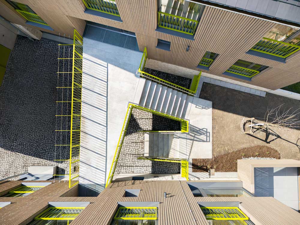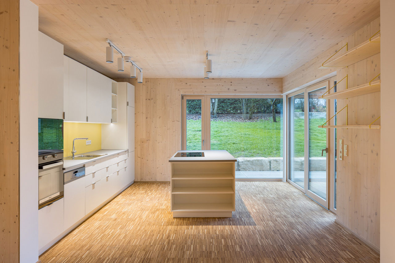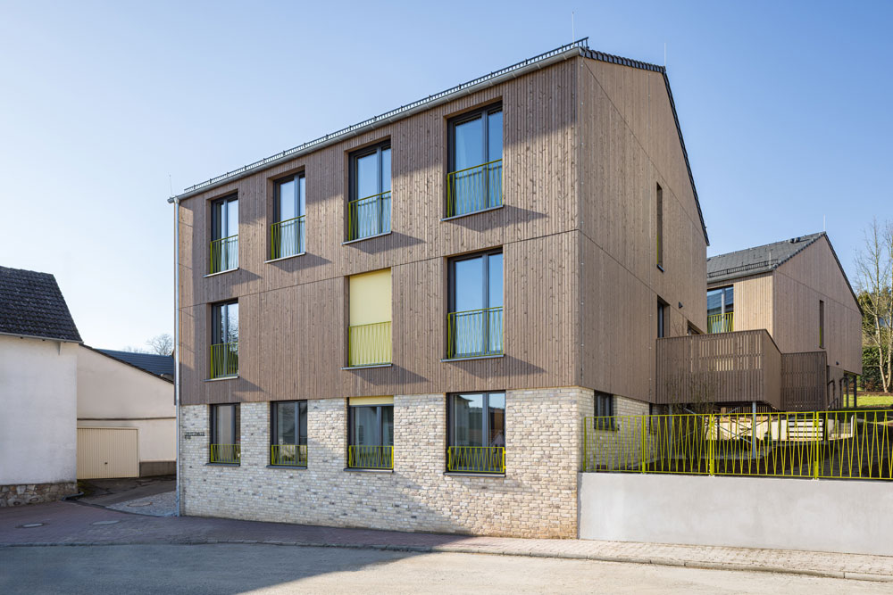 Durch das starke Gefälle gräbt sich das hintere Gebäude in den Hang hinein. Die massiven Sockelgeschosse nehmen die technischen und gemeinschaftlichen Nutzungen auf. Darüber sind zwei Geschosse als Holzbau geplant, die die Wohnbereiche beherbergen. PV-Anlagen auf den Süddächern und eine geothermische Wärmegewinnung ermöglichen einen effizienten Betrieb des Gebäudes ohne Einsatz fossiler Brennstoffe.