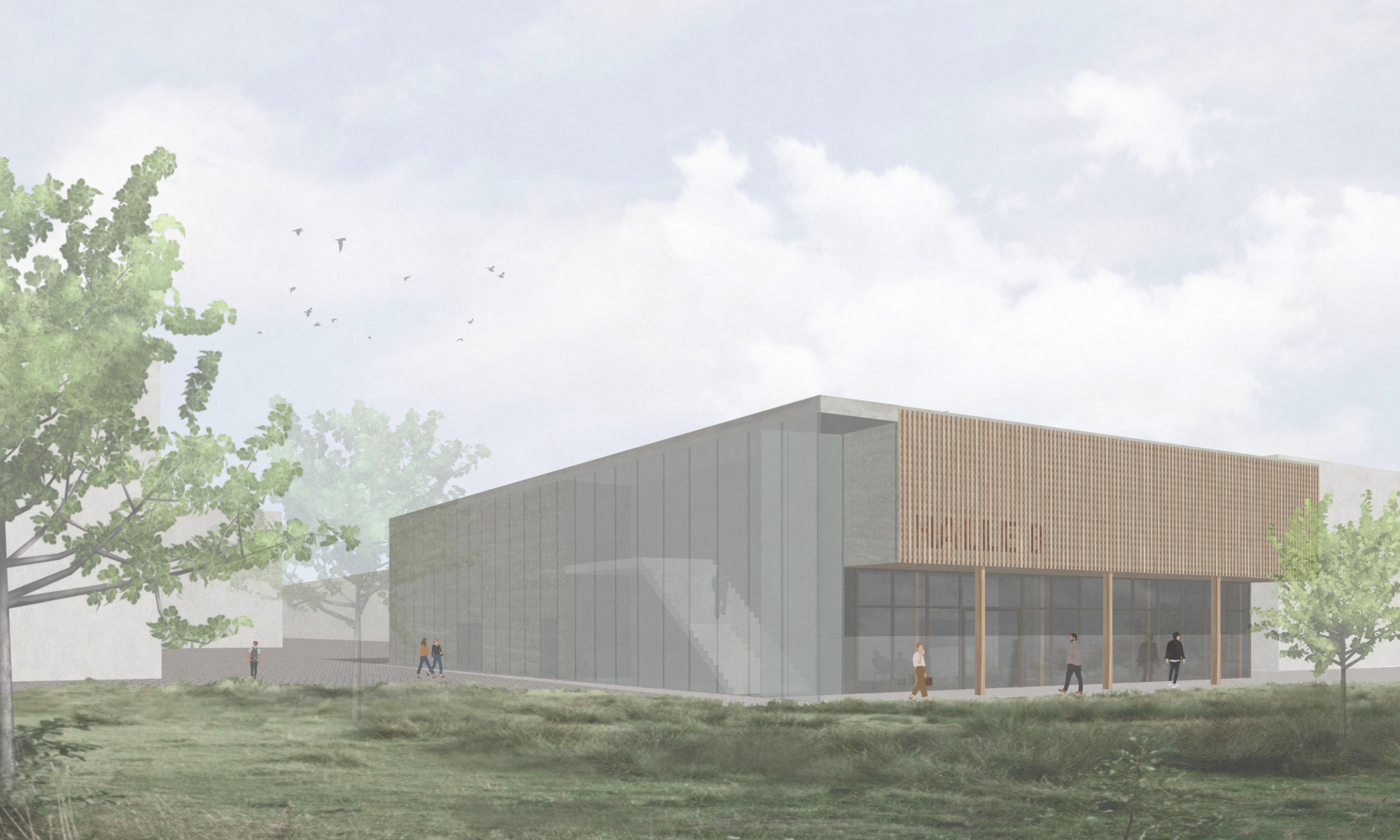 Der Neubau des Sozialgebäudes auf dem Gelände der Stadtbildpflege Kaiserslautern vereint Aufenthaltsqualität mit funktionaler Effizienz und orientiert sich gestalterisch wie baulich an Prinzipien der Kreislaufwirtschaft. Der kompakte, zweigeschossige Holzskelettbau fügt sich zwischen Bestandshallen ein und nutzt eine klare Erschließungslogik sowie transluzente und hölzerne Fassaden für eine einfache, angenehme Atmosphäre. Die innenliegenden Sozialräume wie Kantine, Umkleiden und Veranstaltungsbereiche sind zoniert, gut belichtet und klimatisch sinnvoll strukturiert. Eine klare Trennung zwischen Arbeits- und Aufenthaltsbereichen sowie eine Schwarz-Weiß-Organisation der Umkleiden gewährleisten hygienische und funktionale Abläufe. Die Stampflehmwände im Norden und Süden regulieren Temperatur und Luftfeuchtigkeit passiv, während die transluzente Polycarbonatfassade im Süden als Luftkollektor wirkt. Materialien wie Recyclingbeton, heimisches Holz und Lehm ermöglichen einen sortenreinen Rückbau und zeichnen sich durch niedrige graue Energie aus. Die kompakte Kubatur mit niedrigem A/V-Verhältnis minimiert Wärmeverluste und den versiegelten Flächenbedarf. Durch natürliche Belichtung, Querlüftung und Nachtauskühlung wird der Energieeinsatz reduziert, ergänzt durch eine effiziente Lüftungsanlage mit Wärmerückgewinnung. Auf dem Dach erzeugen PVT-Module klimaneutral Strom und Warmwasser für den Eigenbedarf. Regen- und Grauwasser werden gesammelt, gefiltert und zur Toilettenspülung oder Gartenbewässerung wiederverwendet – ein zukunftsfähiges, ökologisch durchdachtes Gebäude.